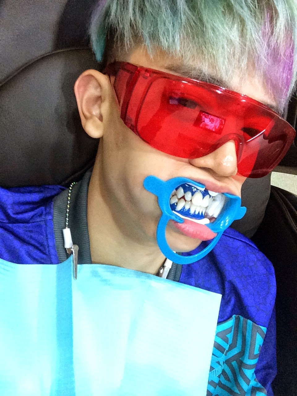 Sorry la, I tried my best to take some picture that is not so kanasai, but with that thing in my mouth really very hard la. So when you doing teeth whitening, make sure people don’t take your picture ok? See I sacrifice myself just to show you guys how it really looks like. Hahahha… So if you drink coffee or tea a alot, or if you smoke ( I don’t smoke) it is easier that your teeth will have yellow stains because it’s acidic and it could make your teeth more vulnerable. So next time go out yum cha just order ice water, no more teh ais or nice coffee art. Hahahhaha…WTF!! So you see the blue gel that is on my gums, it’s actually a rubber dam to protect the gums so that the bleaching product will not affects the gums, if not teeth white gums also white. LOL…